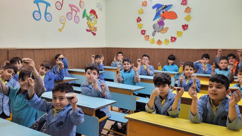 همخوانی سرود “ای ایران” در مدرسه و به اهتزاز درآمدن پرچم سهرنگ ایران به مناسبت هفته دفاع مقدس